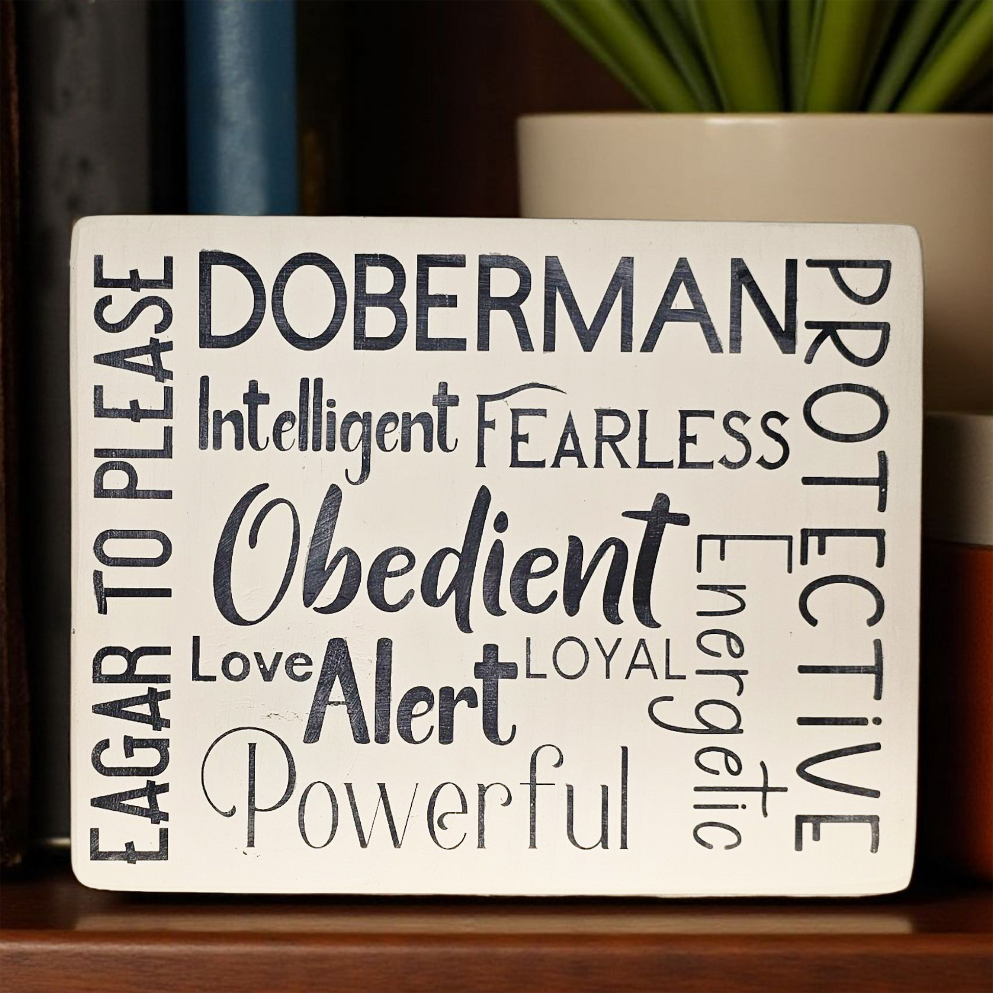 Show your love for the loyal and noble Doberman with this handcrafted wood subway-style sign. Designed in a rustic farmhouse look, this piece lists the proud and charming attributes of the Doberman in bold typography—making it the perfect wall art for any dog lover’s home.