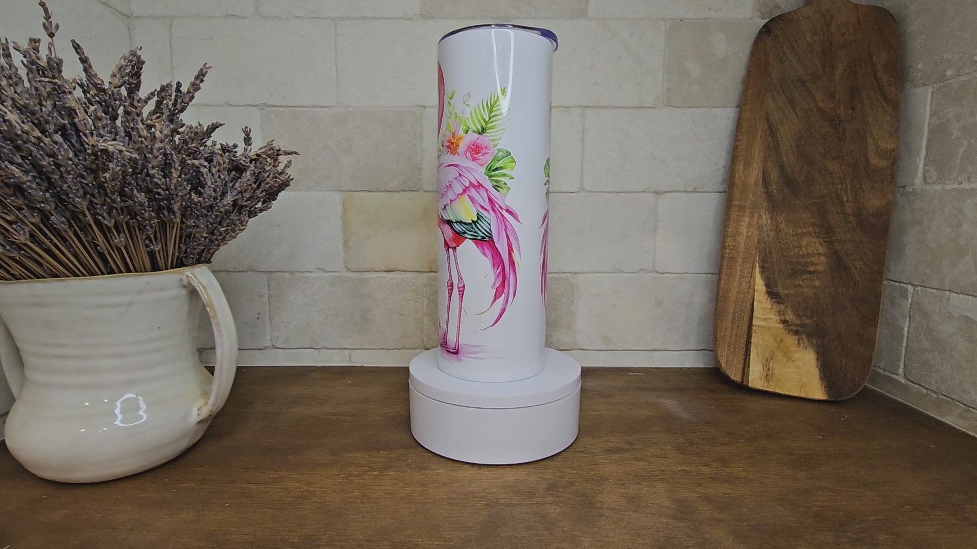 Sip in style with this adorable Personalized Flamingo Tumbler! Featuring two charming flamingos and your custom name, this 20 oz stainless steel tumbler is perfect for tropical lovers, beach goers, or anyone who loves a splash of fun in their drinkware.