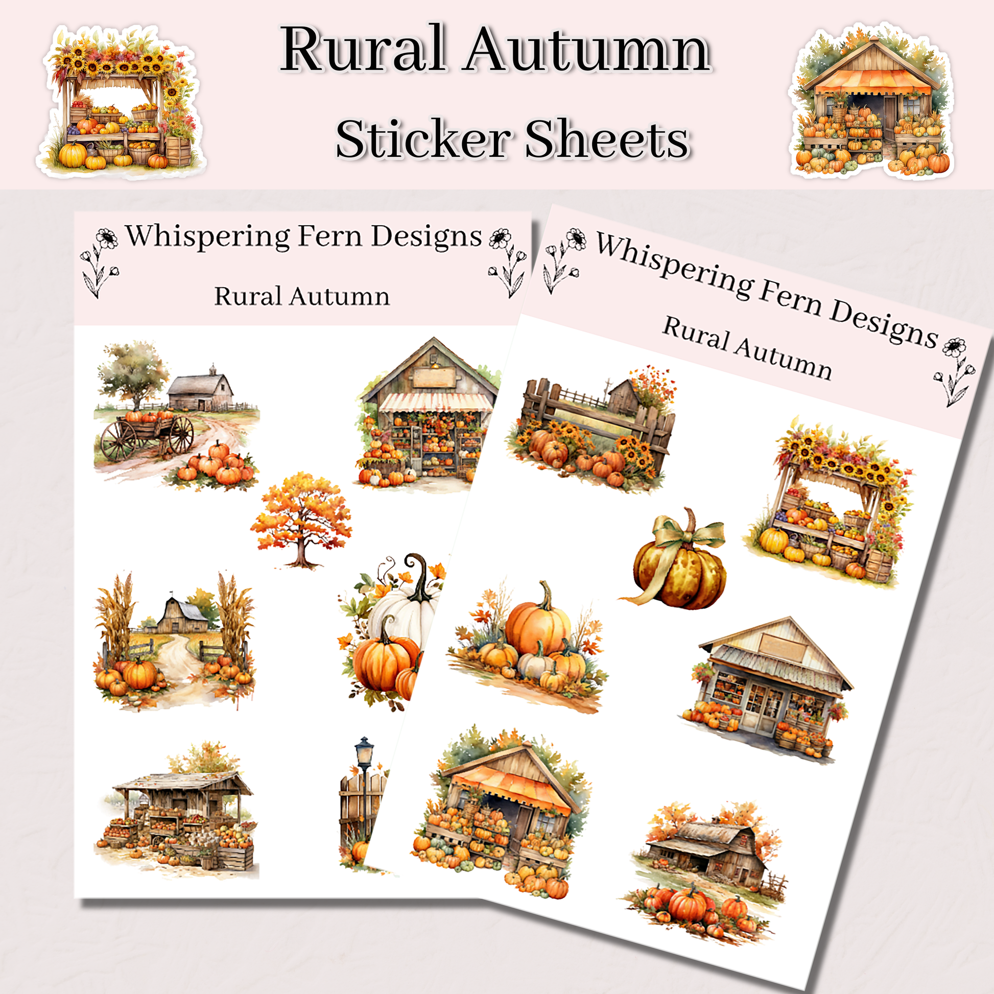 Bring the charm of the countryside to your crafts with this Rural Autumn Sticker Sheet! Each sheet features cozy scenes of rustic barns, pumpkin-filled fruit and veggie stands, and harvest displays brimming with fall vegetables and fruits. Perfect for decorating journals, planners, scrapbooks, pen pal mail, or seasonal DIY projects.