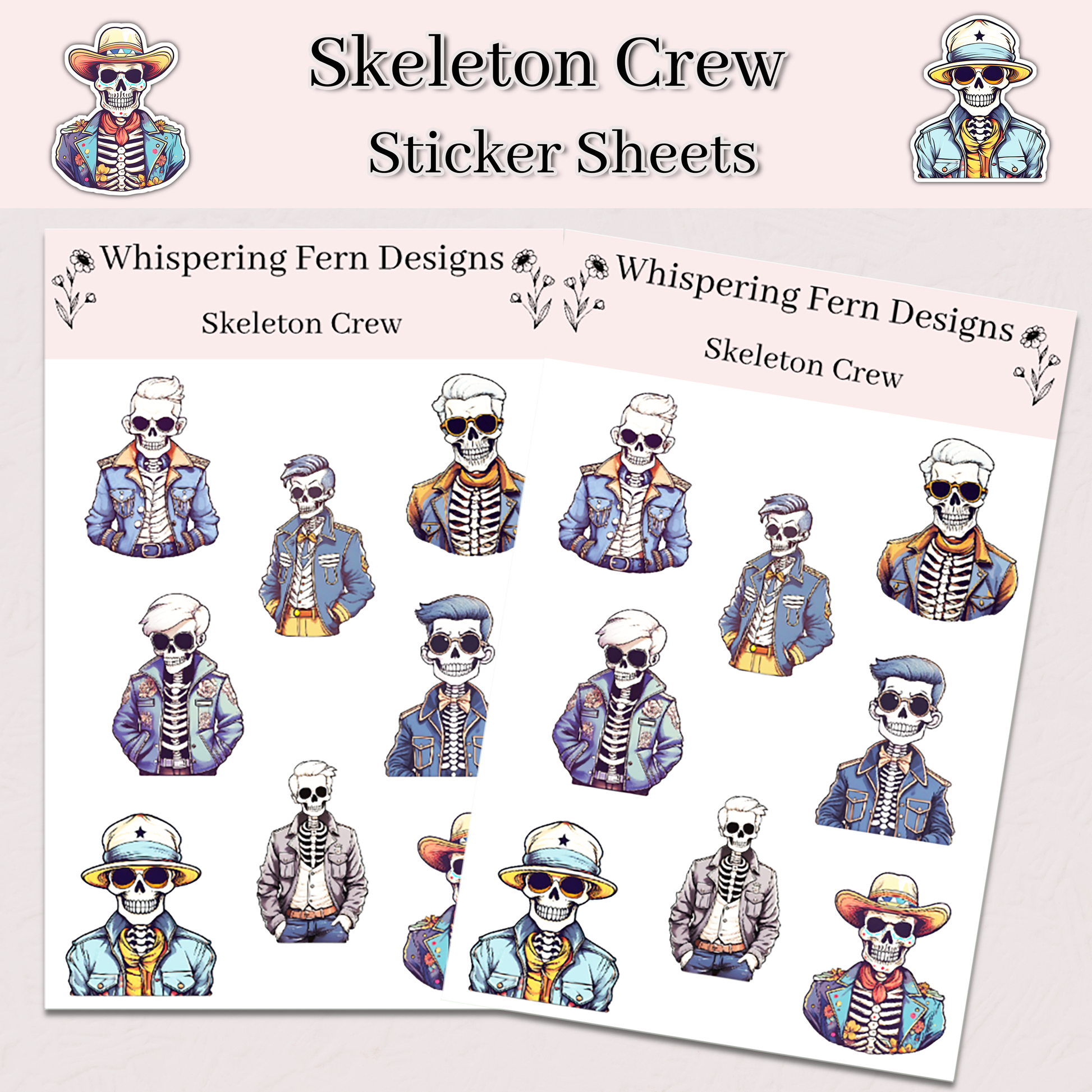 Each sticker sheet features stylish skeletons rocking jackets and attitude. These fun and quirky designs are perfect for anyone who loves a little spooky flair mixed with personality and style.