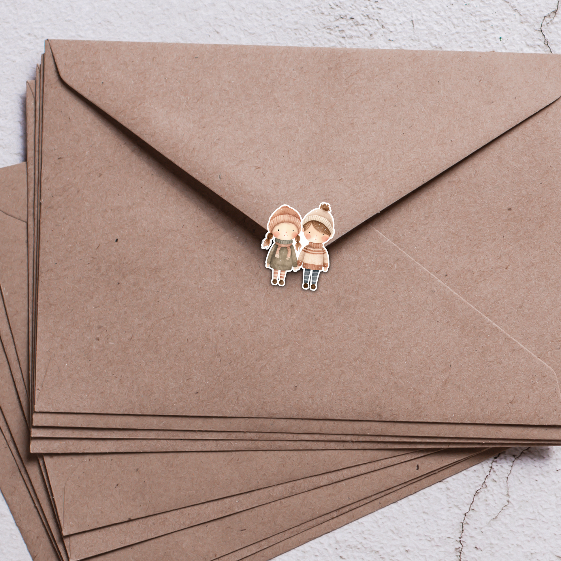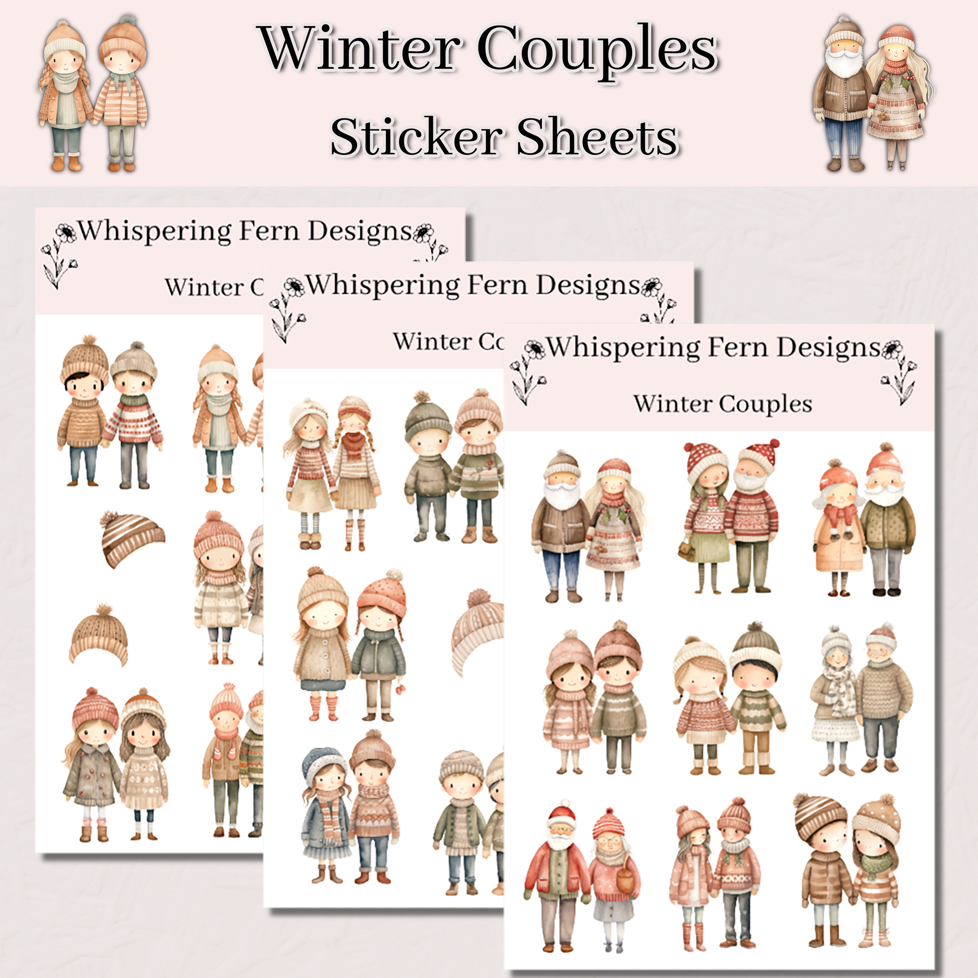 Celebrate the season of cozy moments with this Winter Couple Sticker Sheet.. Each sticker features adorable couples dressed warmly for winter—bundled up in scarves, coats, mittens, and hats—perfect for adding a touch of love and warmth to your crafts and planners.