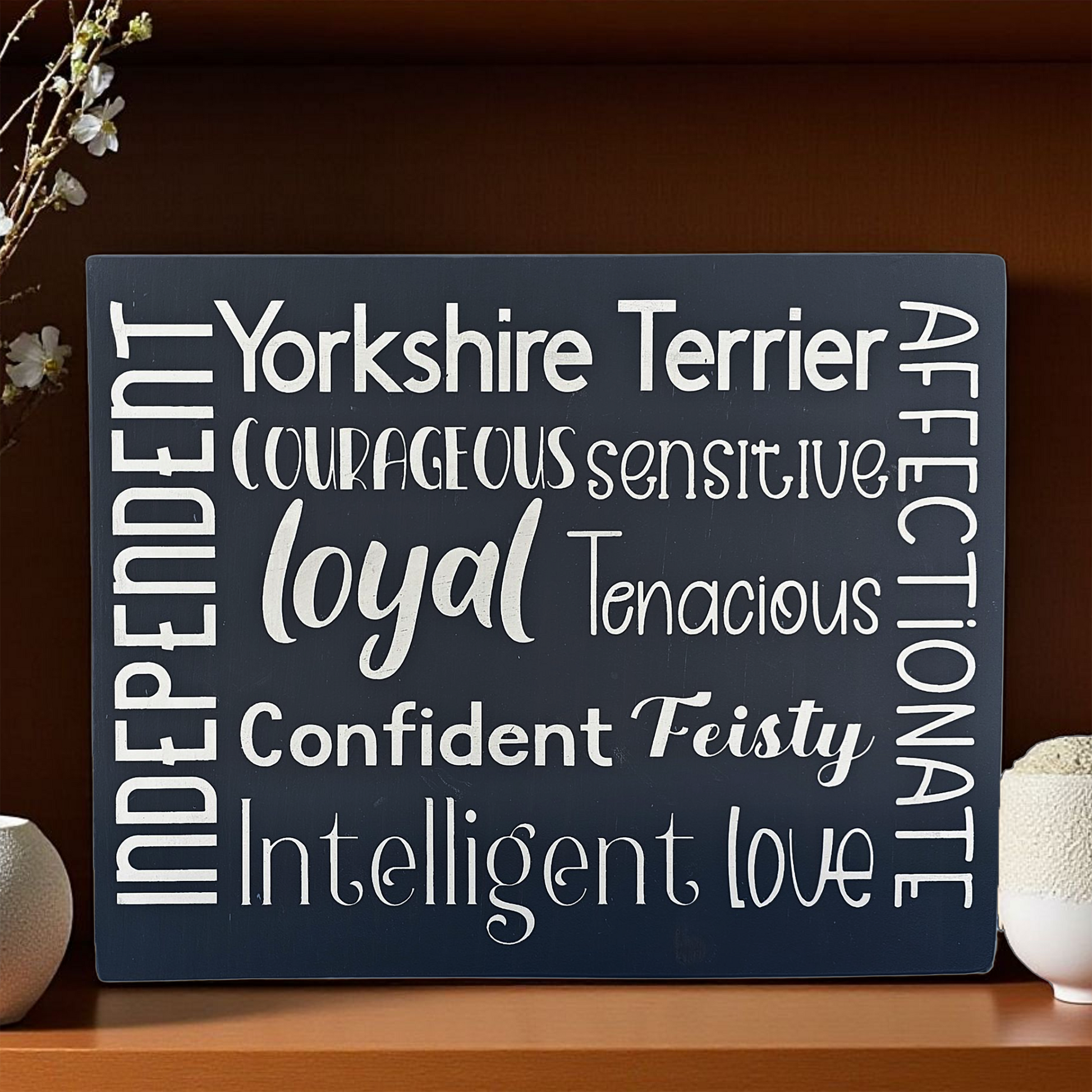 Celebrate your love for the Yorkshire Terrier with this handcrafted wooden subway-style sign! Designed in a classic rustic style, this sign highlights the charming traits and playful personality of the beloved Yorkie. Perfect for dog lovers, pet parents, or as a unique gift for any occasion.